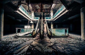 Es ist möglich, auf die oberste Terrasse des Gebäudes zu gelangen, aber es ist absolut keine gute Idee, und die Struktur ist zerbrechlich und weist viele Löcher in den Böden auf.